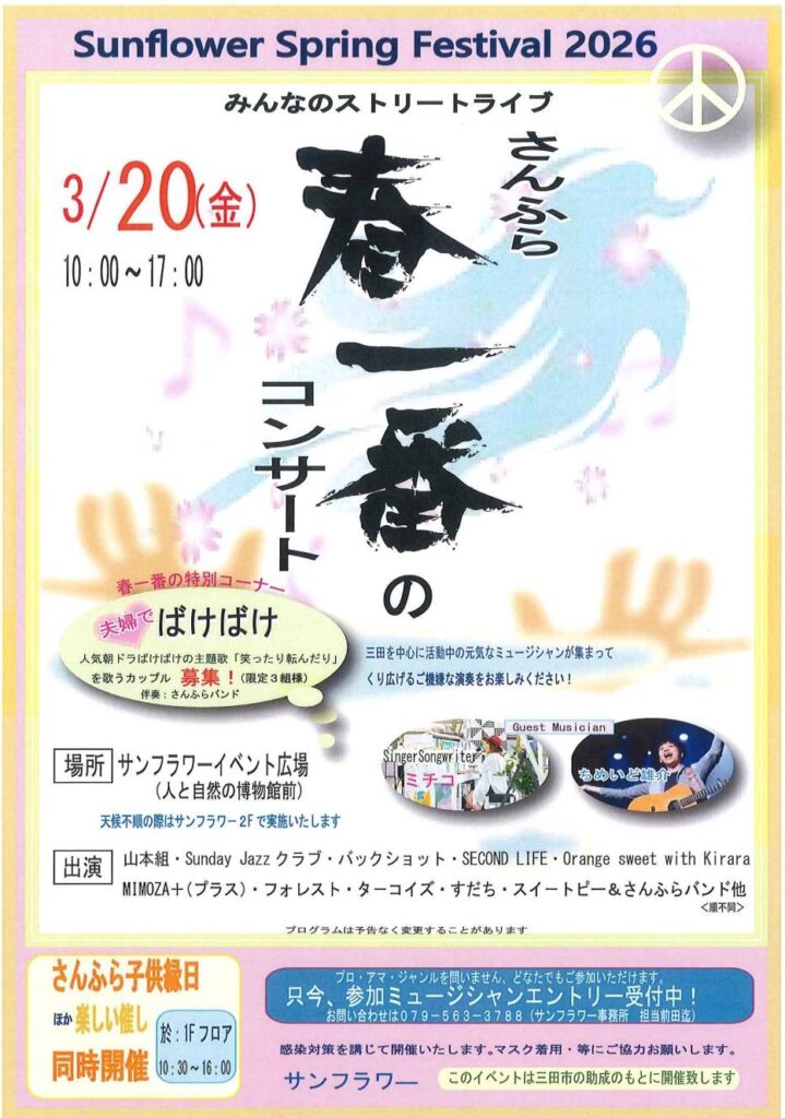 3月20日(金)祝日毎年恒例のサンフラワー春一番のコンサートを開催します♪10時~17時で開催出演者も募集中です♪子ども向けイベントも同時開催です♪詳細は後日アップいたします。みなさまのご来場心よりお待ちしております。